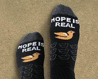 Socks are among the most requested items of homeless shelters throughout North America, yet among the least often donated. We created this high quality series of “Street Strong” socks for people to donate to local communities across North America. The high quality socks were designed to last longer in the harsh street conditions and have positive messages of hope such as ‘You Matter’ and ‘Hope is Real’ to help inspire a life worth living and the possibility of bright, reclaimed futures.
